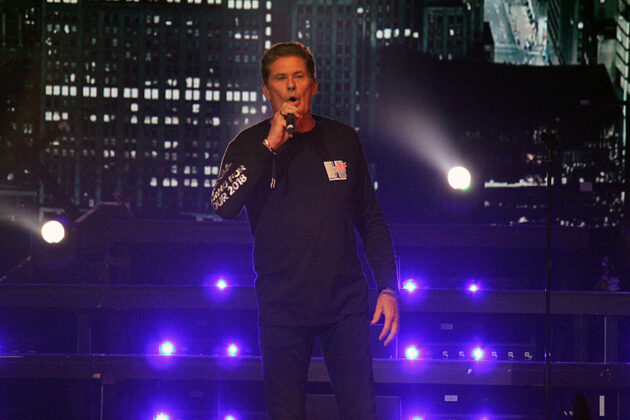 Weiter ging es mit den 90er-Gassenhauern „Crazy for you“ und „Do the limbo dance“, bevor der 65-Jährige im Duett mit einer Background-Sängerin auf deutsch „Wir zwei allein“ anstimmte. Seine Verbundenheit mit Deutschland zeigte sich im Laufe der Show immer wieder. So auch bei den letzten zwei Stücken des Abends: Bei „Heroes“ von David Bowie wurden historische Bilder vom Fall der Berliner Mauer eingespielt. Wenig später folgten weitere Szenen aus Berlin, als der Hoff in blinkender Lederjacke seinen bekanntesten Hit aller Zeiten anstimmte: „Looking for freedom“. Der Höhepunkt einer rund zweistündigen Show. Die Begeisterung des Publikums konnte Hasselhoff nur zurückgeben: „I love you more than words can say“. Da machte es den meisten wohl auch sicher nichts mehr aus, dass er Bremen mit Berlin verwechselte („Berlin, I’ll be back“)…