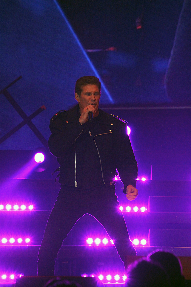 Mit rund 15 Minuten Verspätung startete „The Hoff“ seine Show mit „Hey, We Wanna Rock the World“ und einem umjubelten „Hallo Bremen, wie geht’s?“. Es folgten Songs wie „Jump in My Car“, „Is Everybody Happy“, „Night Rocker“ oder auch „True Survivor“. Letzterer ist das Titellied des Films „Kung Fury“, welcher die trashigen Action-Filme der 80er parodiert. Passend zum Film nimmt auch der Entertainer sich und sein Schaffen nicht allzu ernst. Dass er sich selbst auf die Schippe nehmen kann, zeigte er unter anderem bei der Einleitung seines Songs „Hooked on a Feeling“. Dabei gab er zu, dass es sich damals um sein wohl schlechtestes Video überhaupt gehandelt habe. Als Beweis gab es das Video als Untermalung seiner Performance auf der Leinwand im Hintergrund.
